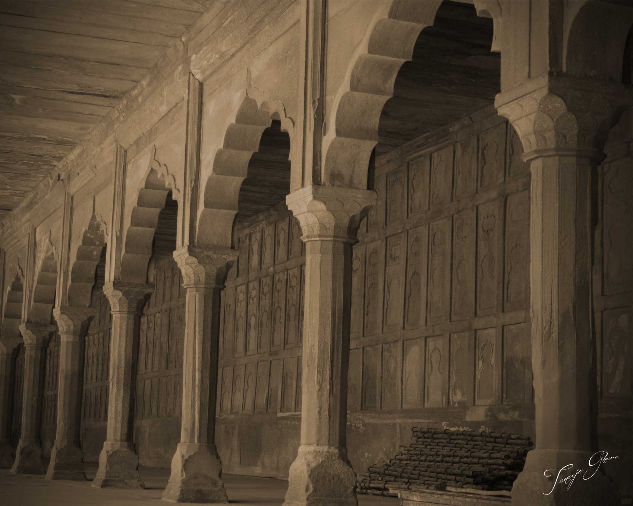The long hallway inside the area surrounding the wonderous Taj Mahal in Sepia!